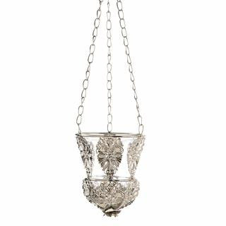 Create an elegant ambiance instantly when you place a candle inside this gorgeous and ornate hanging holder. Delicate silver filigree ornaments grace a beautiful glass candle cup that's rimmed with silver and hangs from three chains.