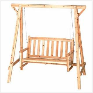 Rustic garden swing is perfect for porch or patio; comfy bench is roomy enough for two! Oil-and-lacquer finished for lasting beauty outdoors. A restful way to dream away the day! Russian pine. Some assembly required. 67 1/3" x 33 1/2" x 65" high.