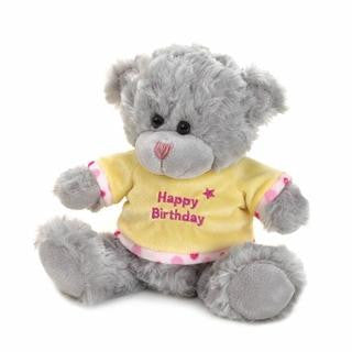 Celebrate a special day with a special plush bear that will inspire smiles all year long! This adorable bear features a yellow fleecy top with pink trim and pink embroidery that reads eHappy Birthday.e